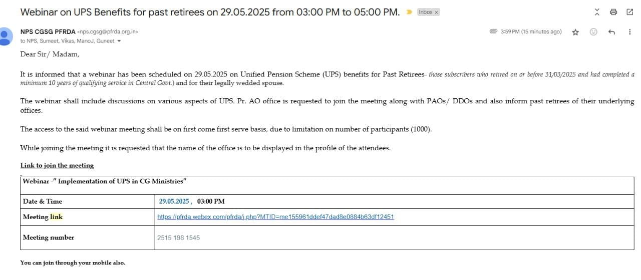 | 26 | 28-05-2025 | Webinar on UPS by PFRDA on 29.05.2025 at 03:00 PM for NPS employees those who have retired on or before 31.03.2025. | View |